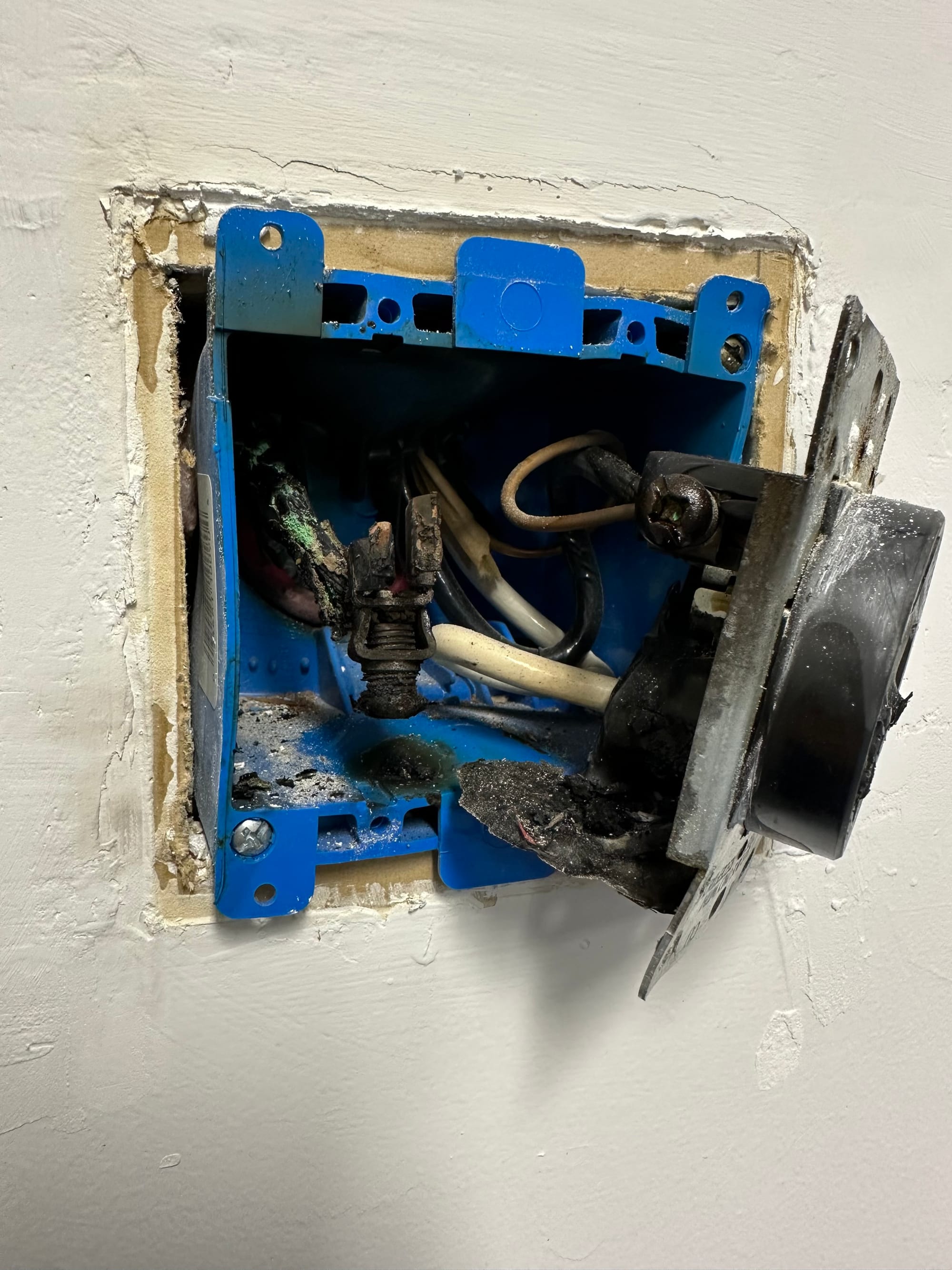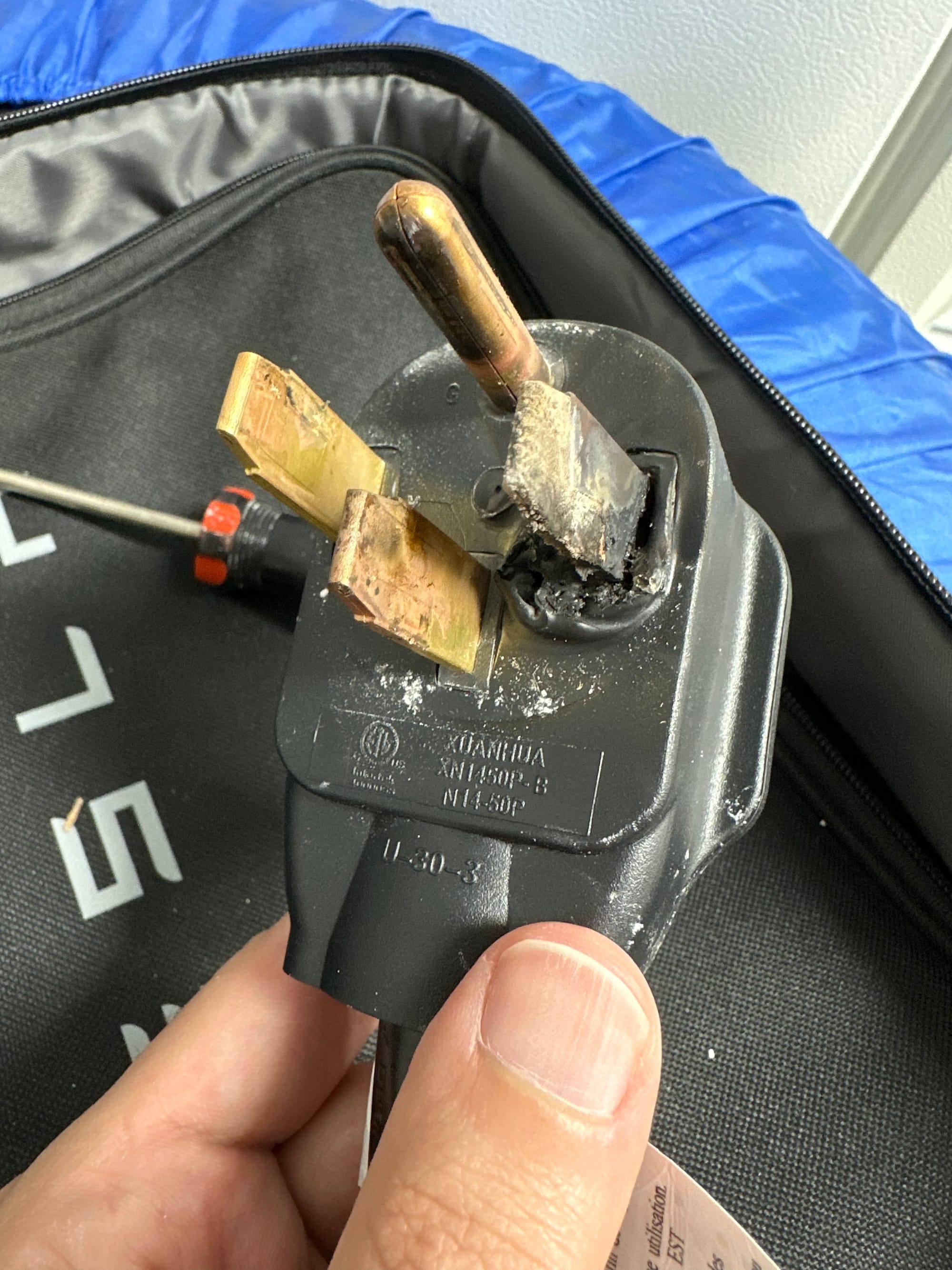 The outlet melted due to wear and tear, as it was a low-cost Home Depot $13 consumer-grade device. The same issues occurred, but here it also melted the cable to the charger. Their extension cord burned out, as it lacked temperature sensors to inform the onboard charger to stop pulling current. Due to the high resistance, the contacts get extremely hot from extended current draw, leading to complete melting.